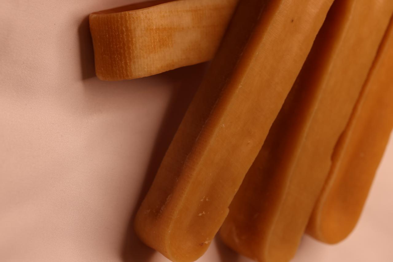 Eco Friendly Hard Cheese Dog Chew This high protein, long lasting chew is designed for durability and “No Waste” consumption. It is likely made from traditional yak or cow milk, which results in a hard texture that supports dental health by scraping away plaque.